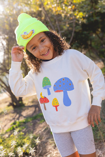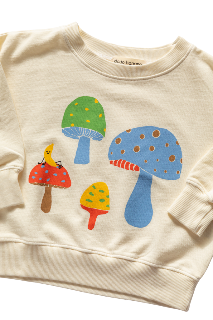 This easy breezy drop shoulder sweatshirt is made of the softest 100% Organic Cotton Terry and screen printed with our original multicolor magical mushrooms print. Perfect to mix and match from day to night with your favorite Mushroom tee or Dodo Mushroom jammies.