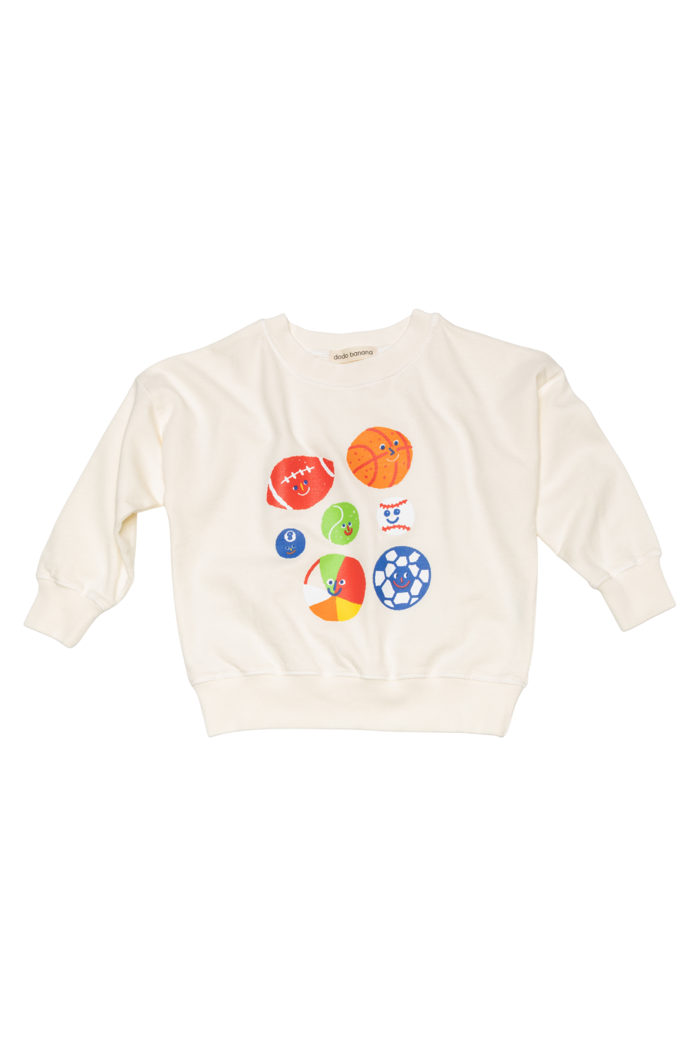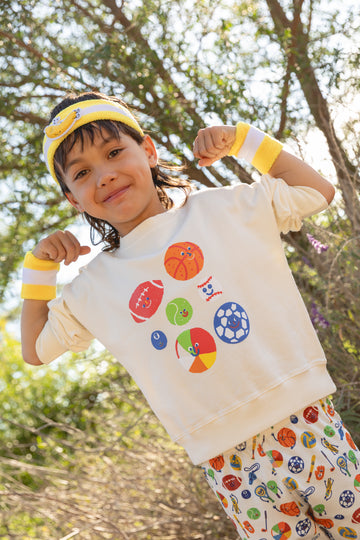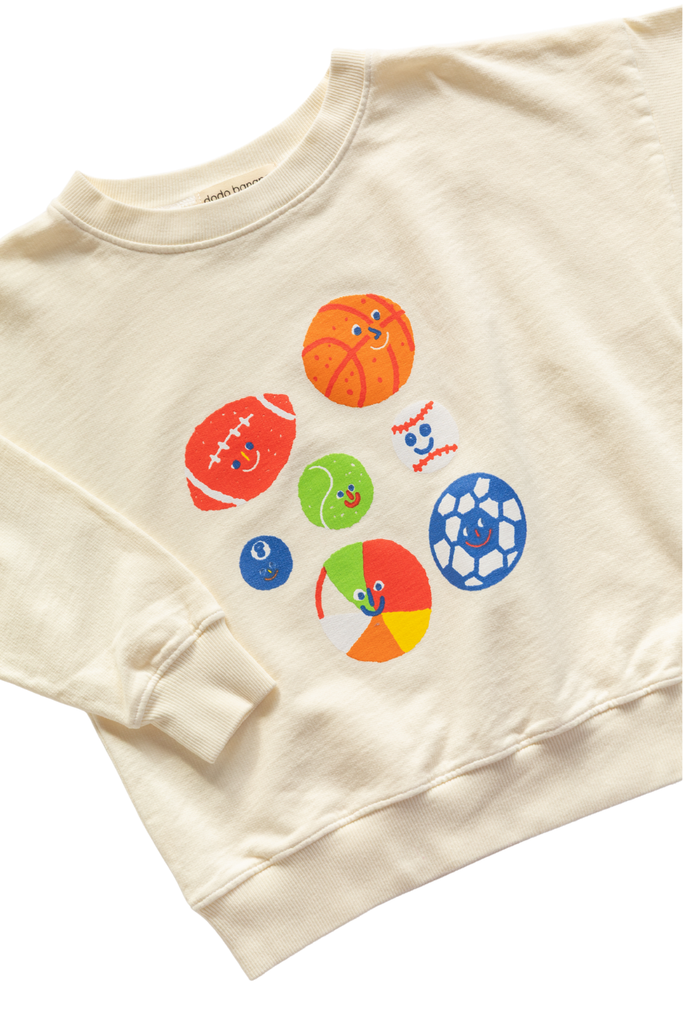 This easy breezy drop shoulder sweatshirt is made of the softest 100% Organic Cotton Terry and Screen printed with the liveliest bunch of sports balls. Original artwork by Jordan Sondler for Dodo Banana. Perfect to mix and match from day to night with your favorite Dodo Play Ball jammies and Go Bananas! tee.